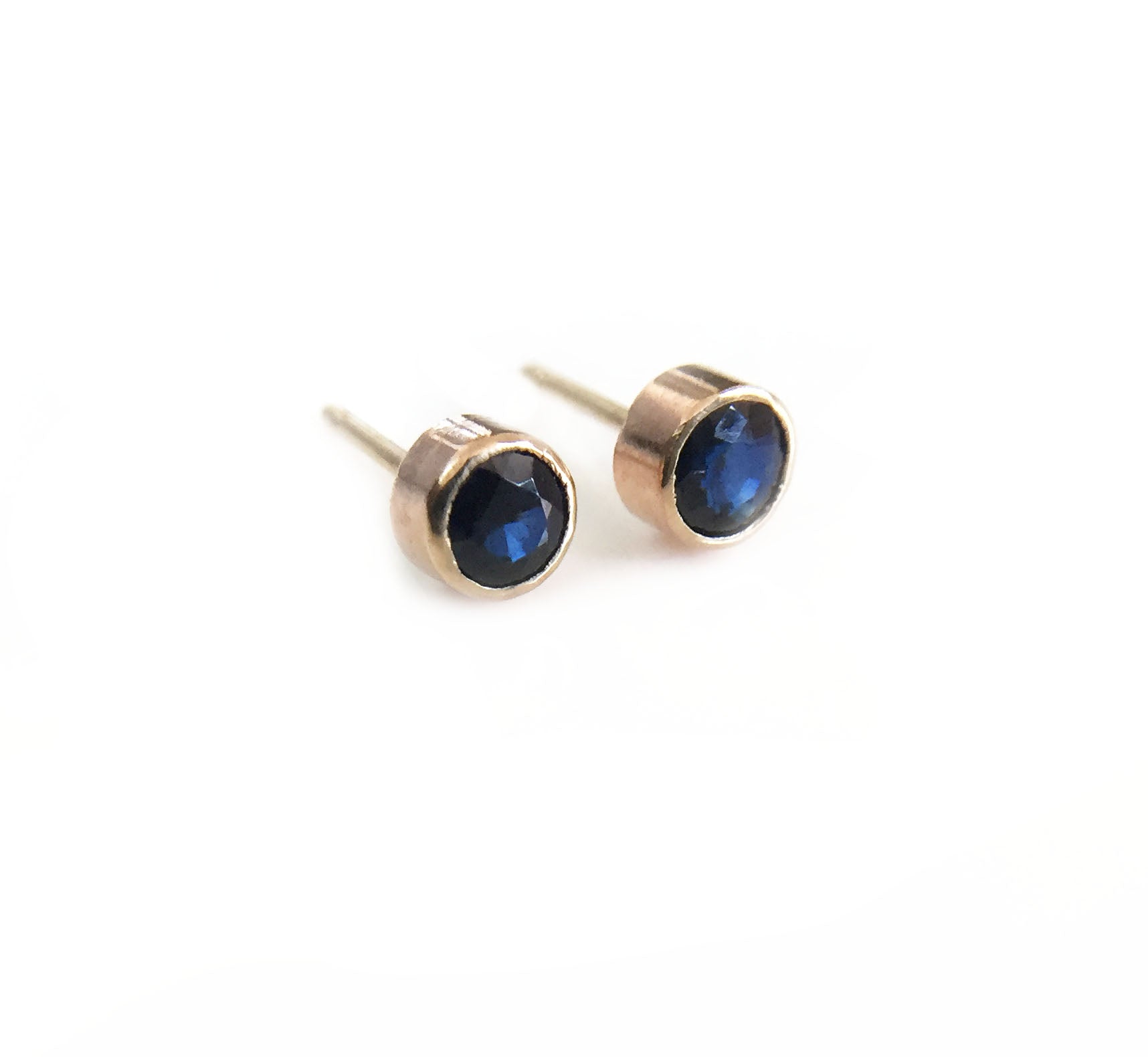 4mm 14k gold sapphire studs. 4mm brilliant cut natural sapphires set in 14k yellow gold bezels.