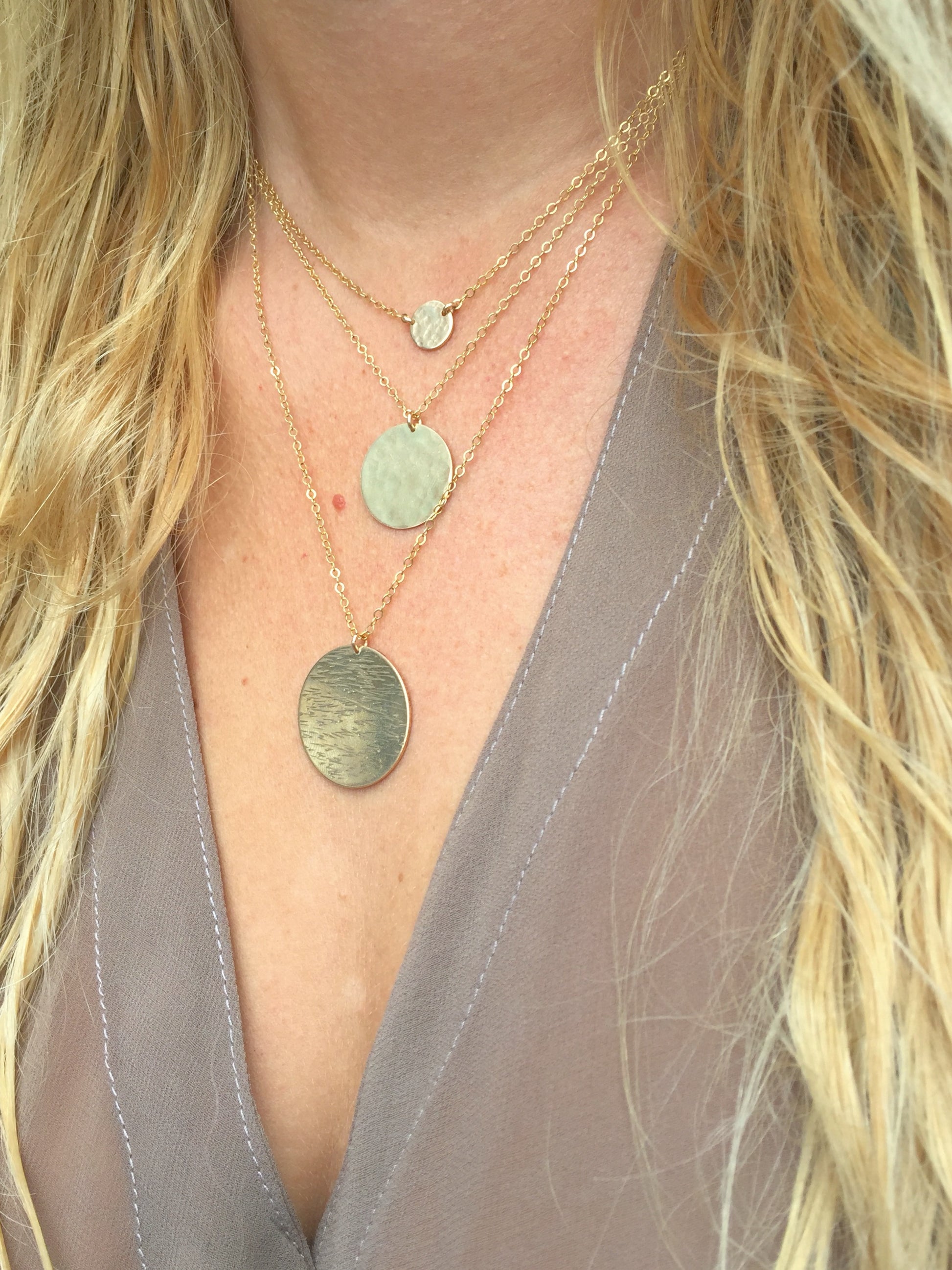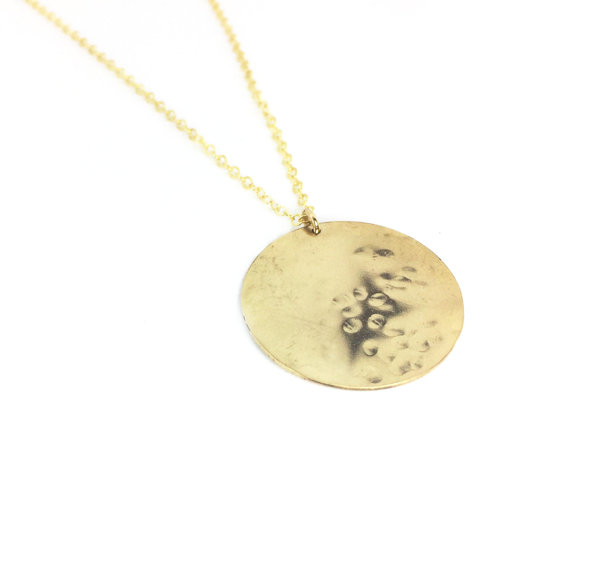 Large Medallion necklace on an 18” 14K gold filled chain.14K gold filled medallion measures 1” and has a hammered textured finish.