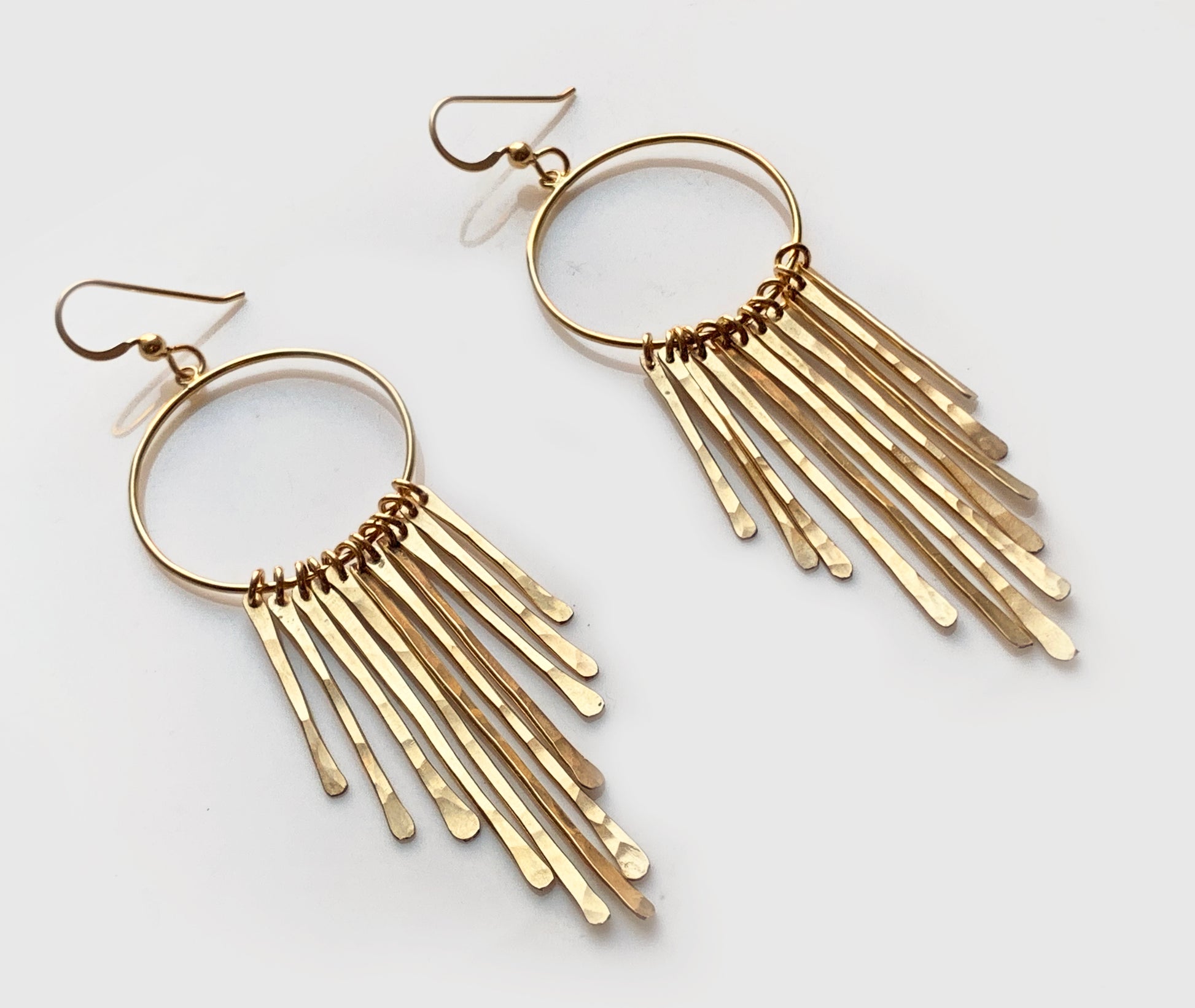 These hammered sunburst earrings hang 2" long and 1" wide. Made out of 14k gold filled.