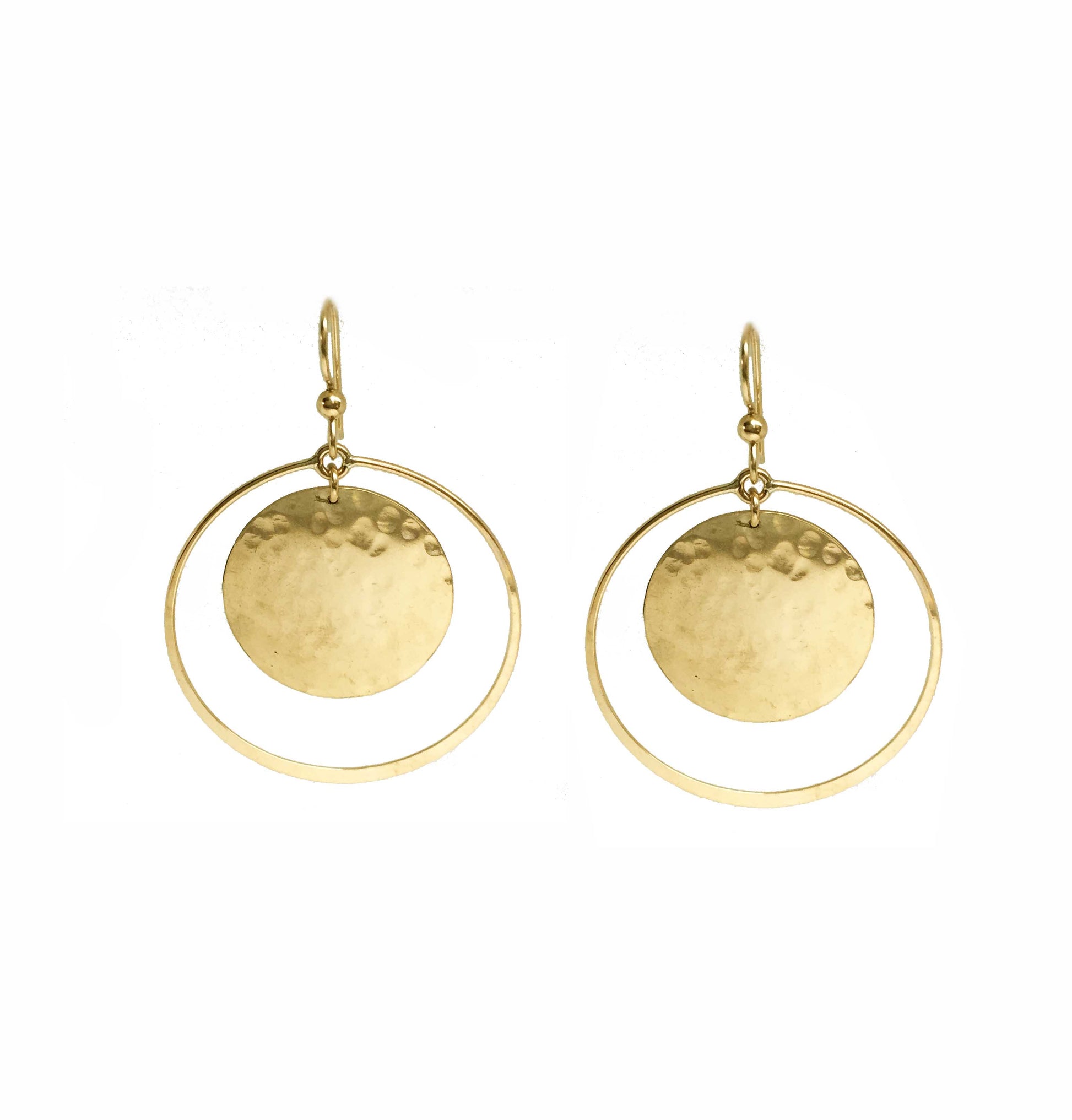 Saturn earrings measure 1 1/2" and are made of 14k gold filled. Finished with a hammered texture.