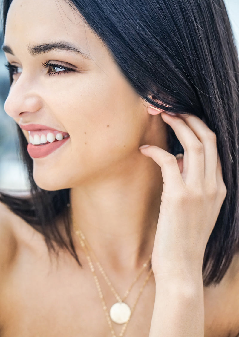 Small medallion necklace on a 16” 14K gold filled chain. 14K gold filled medallion measures 3/4” and has a hammered textured finish.